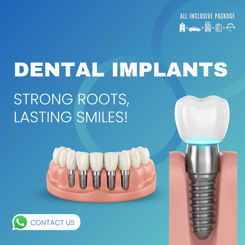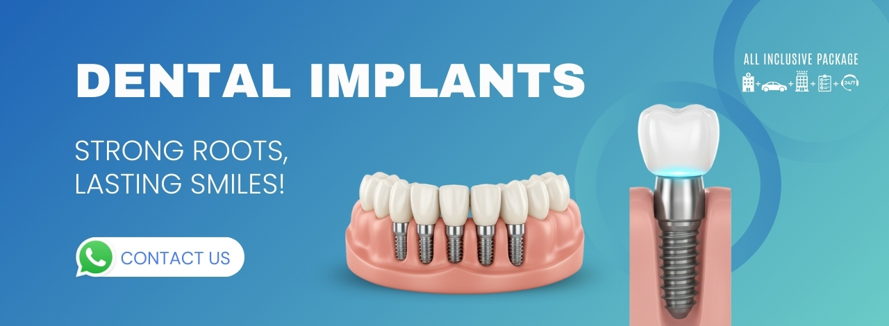 What are dental implants? A dental implant is a titanium screw placed into the jawbone to replace missing teeth. It acts like a natural tooth root and supports crowns made of porcelain or zirconia. Implants are the most permanent and natural-looking solution for tooth loss. Step-by-Step: How Is the Procedure Done? Examination & Planning – 3D imaging and x-rays are used to plan your treatment. Implant Placement – The implant is inserted under local anesthesia. Healing Period – Bone integration takes 2–3 months. Final Crown – Zirconia or porcelain crowns are fitted to complete your smile. Why Choose Turkey for Dental Implants? Affordable Treatment Compared to the UK, Germany, and Italy, implant treatments in Turkey are significantly more affordable — without compromising on quality. Experienced Dentists Turkish dentists are internationally accredited and experienced in advanced techniques, offering personalized treatment plans. Fast and Efficient Most procedures are completed in a single trip. With modern technology, healing is fast and the process is pain-free. Combine Vacation & Treatment Enjoy the beautiful cities of Turkey while getting your smile restored. Services for European Patients Flight support Transfers Hotel accommodation Multilingual support 24/7 assistance Personalized care How Much Does It Cost? Dental implant treatment is offered at much more affordable prices in Turkey compared to European countries. Compared to the high costs encountered in countries such as England, Germany, Ireland and Italy, accessible prices are possible in Turkey without compromising on quality. Treatment costs vary depending on the implant brand used, your jaw structure, necessary additional procedures (such as bone graft, sinus lift) and the scope of the treatment. The most accurate and personalized price information is provided after a free preliminary evaluation. After our experts make a special plan for you, they provide detailed information about the treatment duration and estimated cost. Contact us now for a free consultation and preliminary evaluation. Make an Appointment Now Regain both your smile and self-confidence with dental implant treatment in Turkey. Contact us to get detailed information about our special flight-supported and all-inclusive packages for our patients coming from Europe.