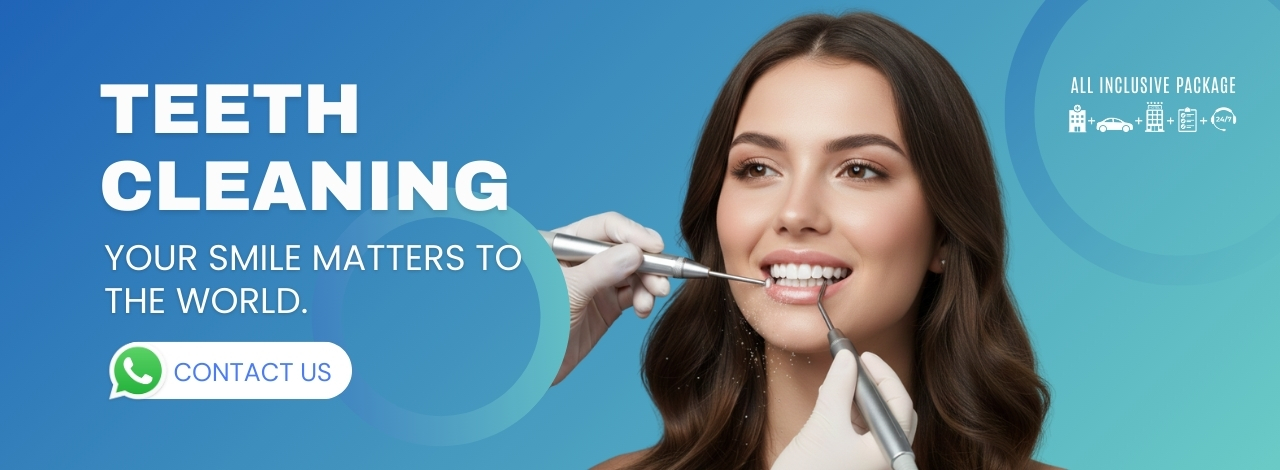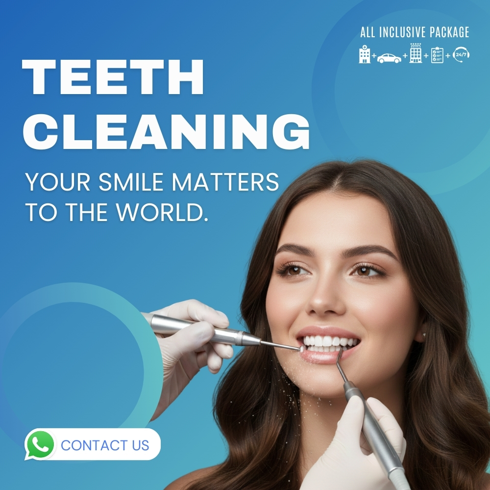Teeth Cleaning & Oral Hygiene Teeth Cleaning and Oral Care – The Foundation of a Healthy Smile What Is Teeth Cleaning? Tartar (dental calculus) is hardened plaque that cannot be removed by daily brushing. Professional teeth cleaning (scaling) removes these deposits using ultrasonic tools in a safe and effective way. It is a vital part of preventive oral health and helps prevent gum disease. Why Get It Done in Turkey? Much more affordable than in Europe Fast and painless ultrasonic cleaning Performed by professional dentists and hygienists Includes post-treatment care and fluoride protection When Is It Needed? Bleeding or swollen gums Bad breath Yellowing or dark stains between teeth Gum sensitivity or recession If it’s been more than 6 months since last cleaning Who Is It For? Anyone over 16 years old Patients with early gum problems Pre-treatment for implants, crowns, or orthodontics Smokers or those with stained teeth How Is It Performed? Oral exam and plaque analysis Ultrasonic scaling Polishing the teeth Optional fluoride application Personalized hygiene instructions Duration: ~20–30 minutes. No recovery time needed. Services for European Patients Flight support Airport–hotel–clinic transfers Hotel Accommodation Multilingual patient coordinators 24/7 support Free companion stay How Much Does It Cost in Turkey? Prices vary depending on the level of cleaning and additional care like polishing or fluoride. Turkey offers professional-quality care at a much more affordable price compared to Europe. Contact us for your personalized treatment plan and quote. Book Your Appointment Now Protect your health and smile with professional teeth cleaning and oral care in Turkey. Contact us to learn more about our all-inclusive, flight-assisted packages tailored for European patients.